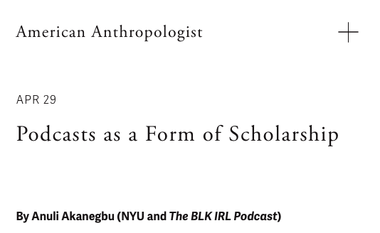 I published an essay titled “Podcast as a Form of Scholarship” on the website for American Anthropologist, the flagship journal of the American Anthropological Association (AAA).