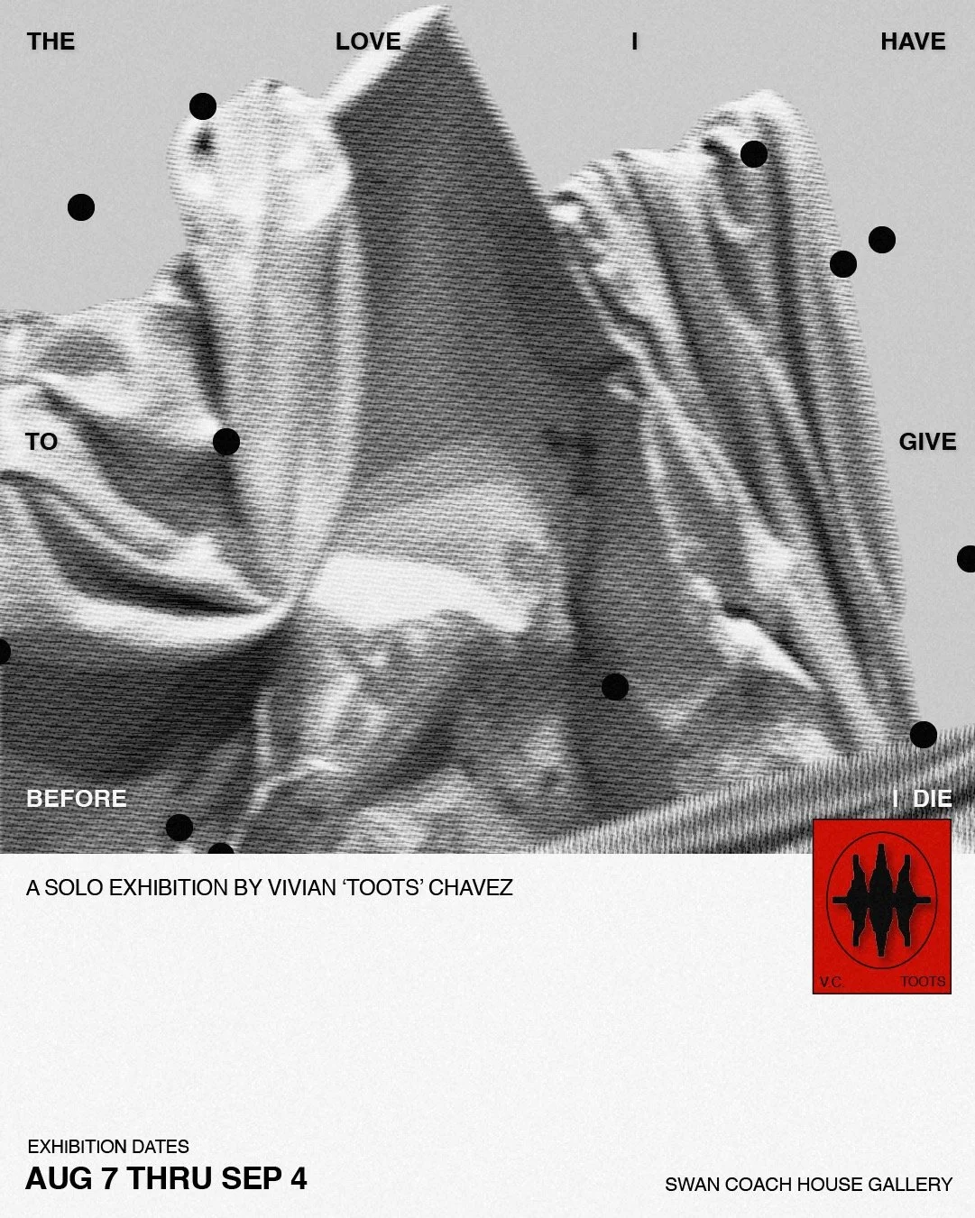 Catch the opening reception for “The Love I Have to Give Before I Die” on Thursday, August 7, from 6-9pm at Swan Coach House Gallery.